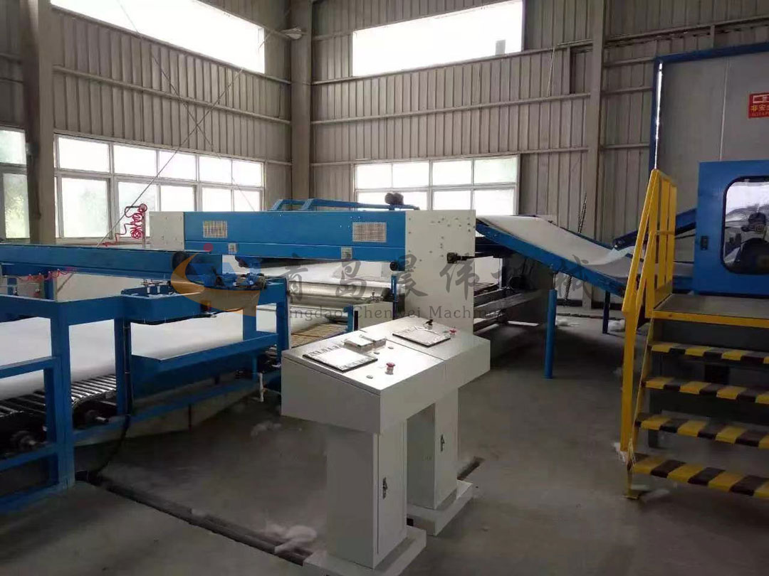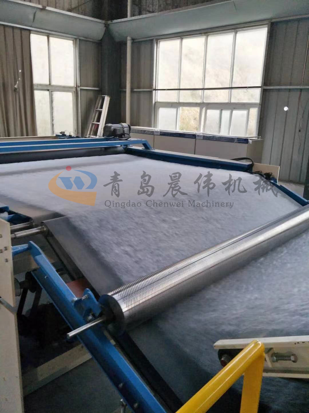 5. CWPW-铺网机:用于将梳理纤网通过移动小车交叉折叠为所需幅宽和定量的多层纤网,以供后道工序使用。铺网辊采用特殊结构,加装压网辊和导流板,不飘网不起皱,五只大功率电机精确控制各部件的运动,电动输出帘高度调节装置