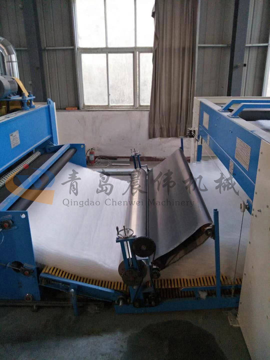 5. CWPW-铺网机:用于将梳理纤网通过移动小车交叉折叠为所需幅宽和定量的多层纤网,以供后道工序使用。铺网辊采用特殊结构,加装压网辊和导流板,不飘网不起皱,五只大功率电机精确控制各部件的运动,电动输出帘高度调节装置